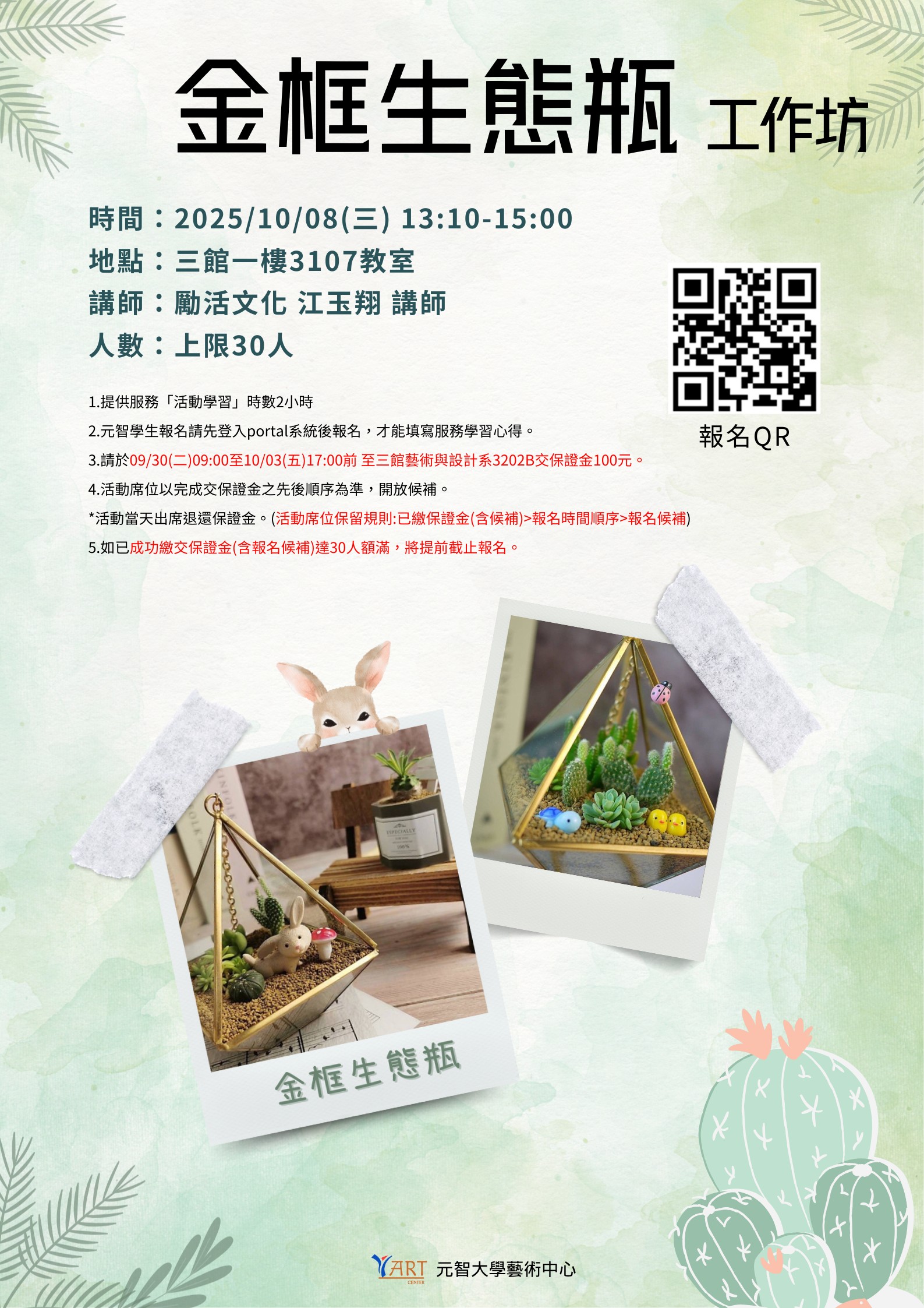 【活動說明】 迷你生態瓶-創造專屬瓶中花園 紐約正風行在透明玻璃瓶中,植入喜歡的植物,創造自己的瓶中花園。這每一個個玻璃瓶都是獨一無二的藝術品,每個人都可以創造自己的植物天地,只需要光源照射,不用每天澆水。不用寬廣的空間,也不用費心照料,還能發揮自己巧思,自創瓶中植栽,創作自己的瓶中花園,很適合現代人,快節奏的生活的舒壓方式。 1.瓶中花園介紹 2.金框生態瓶製作與教學 3.DIY時間 4.植物養護與照顧