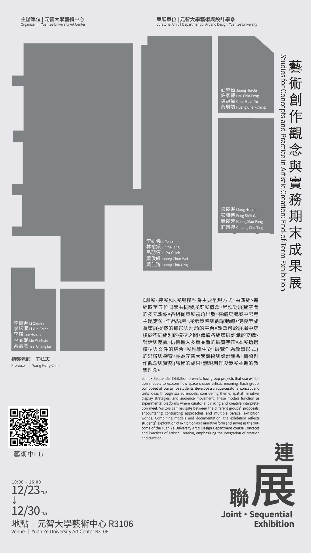 《聯展・連展》以展場模型為主要呈現方式,由四組、每組四至五位同學共同發展群展概念,呈現對展覽空間的多元想像。各組從策展視角出發,在縮尺場域中思考主題定位、作品語境、展示策略與觀眾動線,使模型成為策展提案的雛形與討論的平台。觀眾可於展場中穿梭於不同組別的模型之間,體驗各組策展語彙的交織、對話與差異,彷彿進入多重並置的展覽宇宙。本展透過模型與文件的結合,展現學生對「展覽作為敘事形式」的思辨與探索,亦為元智大學藝術與設計學系「藝術創作觀念與實務」課程的成果,體現創作與策展並進的教學理念。